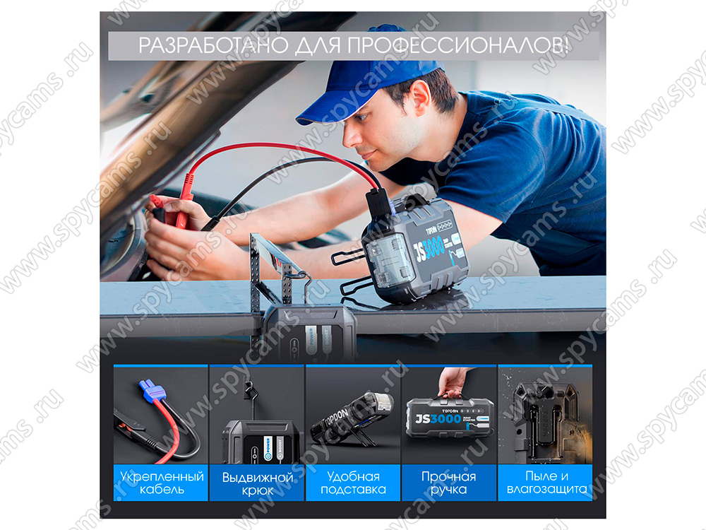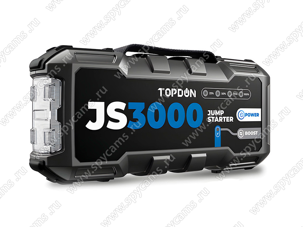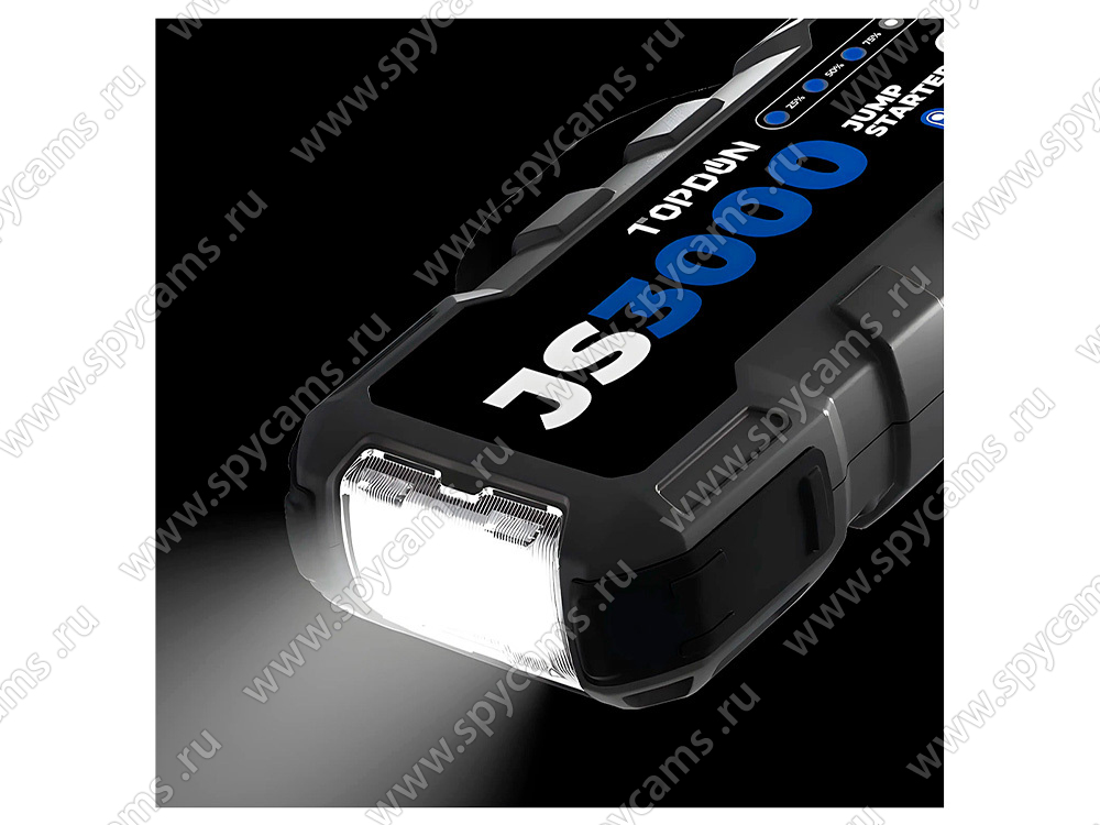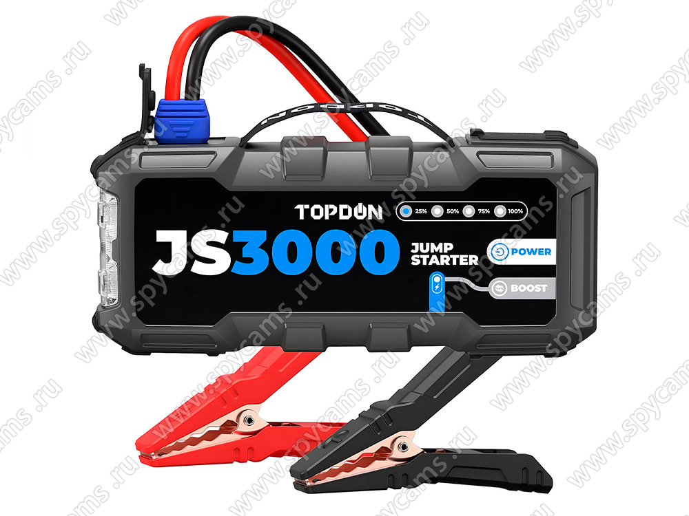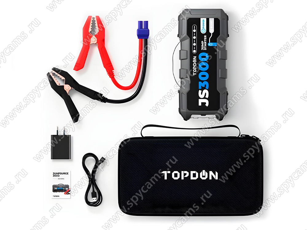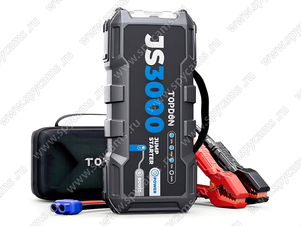 Автомобильное пусковое устройство портативное «Topdon JS3000» (3000A) обладает высоким пусковым током, что позволяет запустить бензиновые двигатели объемом до 9 л и дизельные двигатели объемом до 7 л. Устройство обеспечивает до 45 пусков на одном заряде благодаря встроенному аккумулятору емкостью 24000 mAh. Имеется встроенный светодиодный фонарь. Зарядка устройства осуществляется от источника питания USB или от сети 220 В.